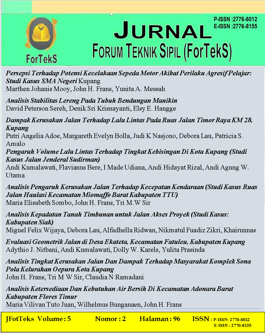 Jurnal Forum Teknik Sipil (FoTeks) adalah jurnal yang berisi kumpulan hasil penelitian dibidang teknik sipil yang bertujuan untuk menyebarluaskan hasil hasil riset ataupun kajian ilmiah di bidang teknik sipil dan bidang lain yang terkait dengan teknik sipil. Artikel-artikel pada jurnal ForTeks volume ke 4 edisi Mei ini membahas tentang berbagai persoalan di bidang teknik sipil antara lain Permasalahan terutama dibidang transportasi,manajemen Konstruksi, Geoteknik, hidrologi, strukturv dan berbagai permasalahan lainnya terkanit teknik sipil. Secara umum masih difokuskan terutama pada bidang teknik sipil dan aplikasinya. Pada edisi pertama volume 3 Jurnal ForTeks dikhususkan pada permasalahan teknik sipil yang lebih luas dan saat ini sedang dihadapi oleh Bangsa Indonesia yaitu perubahan paradigma transportasi, Permasalahan respon bangunan terhadap gempa bumi terutama berdampak pada Infrastruktur Penting, sistim jaringan air bersih, Transportasi, permasalahan geoteknik. Harapannya artikel artikel yang terpublish pada volume ke empat dari Jurnal ForTeks ini dapat membantu memberi informasi dan membantu menyelesaikan permasalahan di bidang teknik sipil