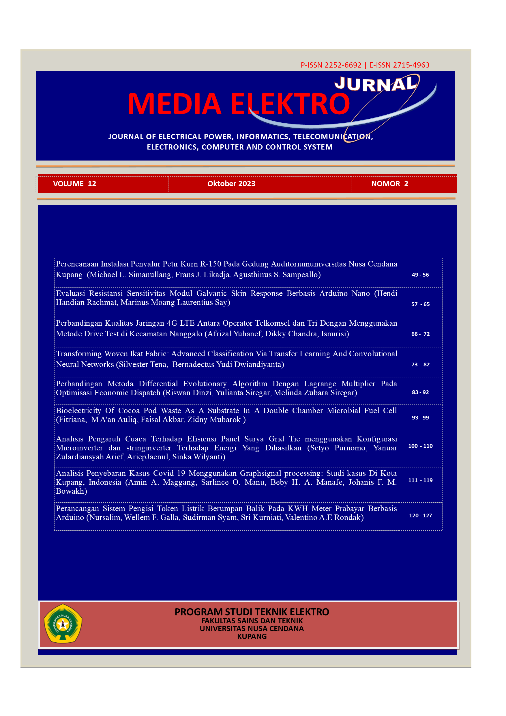 Jurnal Media Elektro: Journal of Electrical Power, Informatics, Telecommunication, Electronics, Computer and Control System is a scientific journal that presents original articles on research knowledge and information or research and development applications. This journal is a means of publication and research and development work in the field of technology that focuses on electrical engineering. Authors who are interested in publishing articles in this journal can contact the manager at the email address: jme@undana.ac.id; or media.elektro.undana@gmail.com. Articles submitted will be selected by the editor which will then be reviewed by competent reviewers in their fields. This journal is published regularly twice a year by Nusa Cendana University.